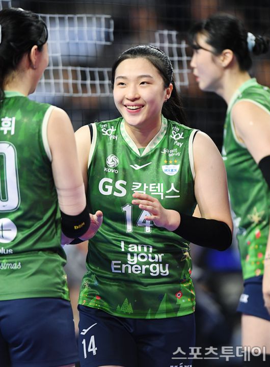 [화성(경기)=스포츠투데이 권광일 기자] 2023-2024 도드람 V-리그 여자부 IBK기업은행-GS칼텍스 경기가 6일 오후 경기도 화성시 화정종합체육관에서 열렸다. GS칼텍스 김지원이 코트에서 미소를 짓고 있다. [스포츠투데이 권광일 기자 sports@stoo.com]