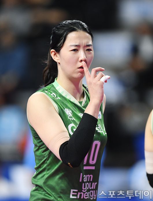 [화성(경기)=스포츠투데이 권광일 기자] 2023-2024 도드람 V-리그 여자부 IBK기업은행-GS칼텍스 경기가 6일 오후 경기도 화성시 화정종합체육관에서 열렸다. GS칼텍스 강소휘가 경기중 코를 만지고 있다. [스포츠투데이 권광일 기자 sports@stoo.com]