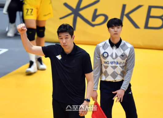 KB 후인정 감독이 6일 의정부체육관에서 열린 2023 도드람 V리그 남자부 KB손해보험과 OK금융그룹과의 경기에서 주먹을 불끈쥐며 자축하고 있다. 2023.12.06.의정부 | 강영조기자 kanjo@sportsseoul.com [기사제보 news@sportsseoul.com] Copyright ⓒ 스포츠서울&sportsseoul.com