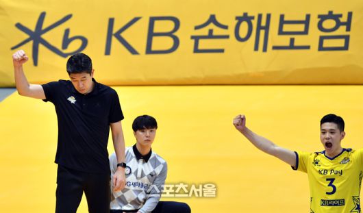 KB 후인정 감독이 6일 의정부체육관에서 열린 2023 도드람 V리그 남자부 KB손해보험과 OK금융그룹과의 경기에서 주먹을 불끈쥐며 자축하고 있다. 2023.12.06.의정부 | 강영조기자 kanjo@sportsseoul.com