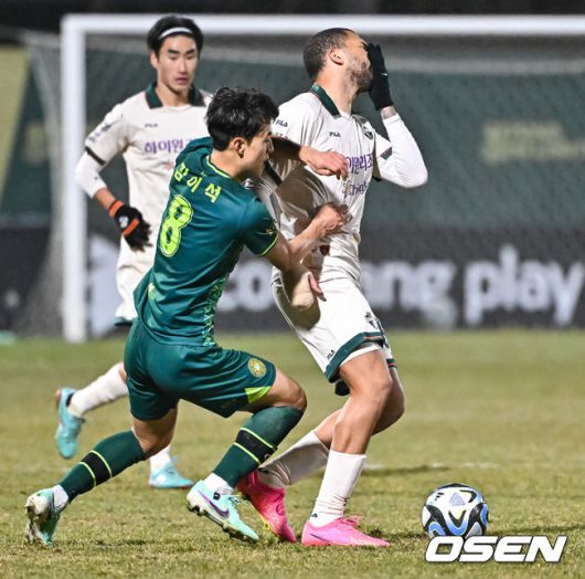 [OSEN=김포, 박준형 기자] 6일김포솔터축구장에서 하나원큐 K리그 2023 승강 플레이오프 1차전 김포FC와 강원FC의 경기가 진행됐다 김포는 올 시즌 K리그2 3위로 시즌을 마무리했고 강원은 K리그1 10위를 기록한 팀이다. 후반 강원FC 가브리엘이 김포FC 김이석에게 파울을 얻어내고 있다. 2023.12.06 / soul1014@osen.co.kr