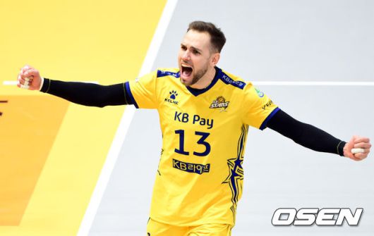 [OSEN=의정부, 조은정 기자]6일 오후 경기도 의정부시 의정부실내체육관에서 ‘도드람 2023-2024 V-리그’ 남자부 3라운드 KB손해보험과 OK금융그룹의 경기가 열렸다. 2세트 득점에 성공한 KB손해보험 비예나가 기뻐하고 있다. 2023.12.06 /cej@osen.co.kr
