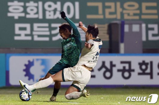 (김포=뉴스1) 김진환 기자 = 6일 오후 경기 김포 솔터축구장에서 열린 하나원큐 K리그 승강 플레이오프 1차전 김포FC와 강원FC의 경기, 김포FC 주닝요가 후반 강원FC 김영빈의 수비에 슈팅이 막히고 있다. 2023.12.6/뉴스1kwangshinQQ@news1.krCopyright ⓒ 뉴스1. All rights reserved. 무단 전재 및 재배포, AI학습 이용 금지.