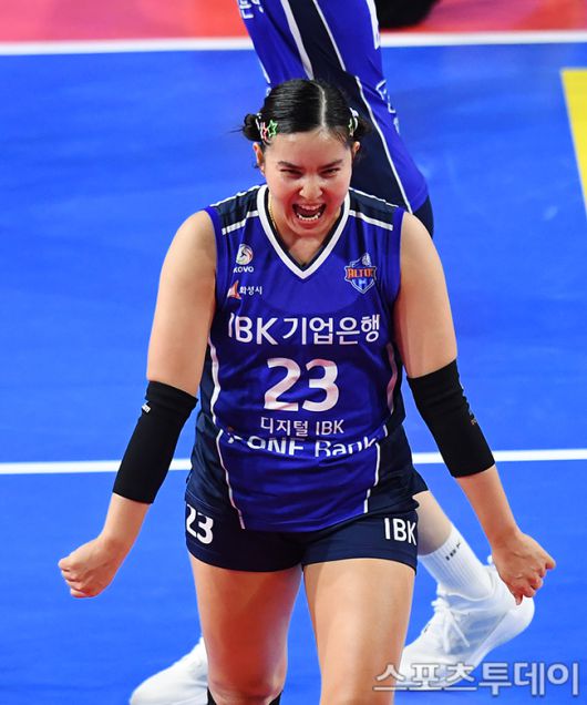 [화성(경기)=스포츠투데이 권광일 기자] 2023-2024 도드람 V-리그 여자부 IBK기업은행-GS칼텍스 경기가 6일 오후 경기도 화성시 화정종합체육관에서 열렸다. IBK기업은행 폰푼이 기뻐하고 있다. 2023.12.06. [스포츠투데이 권광일 기자 sports@stoo.com]