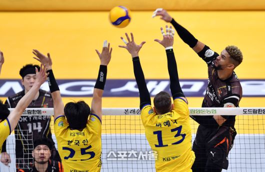 OK 레오가 6일 의정부체육관에서 열린 2023 도드람 V리그 남자부 KB손해보험과 OK금융그룹과의 경기에서 KB 삼중블로킹을 뚫는 공격을 성공하고 있다. 2023.12.06.의정부 | 강영조기자 kanjo@sportsseoul.com [기사제보 news@sportsseoul.com] Copyright ⓒ 스포츠서울&sportsseoul.com
