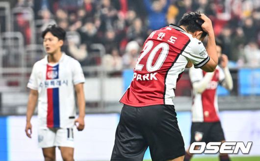 [OSEN=부산, 이석우 기자] 6일 부산아시아드주경기장에서 K리그 승강 플레이오프(PO) 1차전 부산 아이파크와 수원FC의 경기가 열렸다. 부산 아이파크 이한도가 헤딩슛이 골대를 살짝 벗어나자 아쉬워하고 있다. 2023.12.06 / foto0307@osen.co.kr