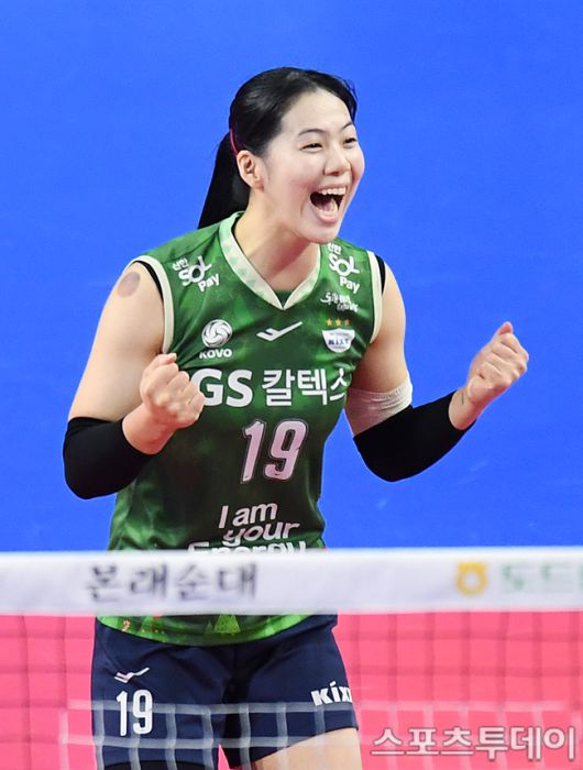 [화성(경기)=스포츠투데이 권광일 기자] 2023-2024 도드람 V-리그 여자부 IBK기업은행-GS칼텍스 경기가 6일 오후 경기도 화성시 화정종합체육관에서 열렸다. GS칼텍스 유소연이 기뻐하고 있다. 2023.12.06. [스포츠투데이 권광일 기자 sports@stoo.com]