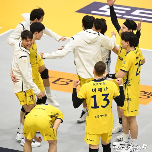 (엑스포츠뉴스 의정부, 김한준 기자) 6일 오후 경기도 의정부실내체육관에서 열린 ‘도드람 2023-2024 V-리그’ KB손해보험과 OK금융그룹의 경기, KB손해보험이 OK금융그룹에 세트스코어 3:0(25-20 25-23 25-17)으로 승리하며 12연패에서 탈출했다. 이날 경기에서 승리한 KB손해보험 선수들이 기뻐하고 있다.김한준 기자 kowel@xportsnews.com