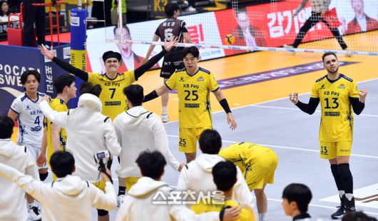 KB 비예나와 선수들이 6일 의정부체육관에서 열린 2023 도드람 V리그 남자부 KB손해보험과 OK금융그룹과의 경기 3세트를 따내며 OK를 셧아웃시킨후 연패탈출의 기쁨을 만끽하고 있다. 2023.12.06.의정부 | 강영조기자 kanjo@sportsseoul.com