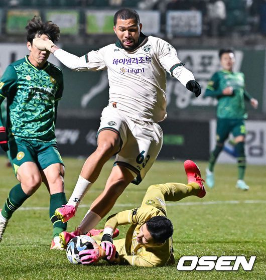 후반 김포FC 박청효 골키퍼가 강원FC 가브리엘보다 앞서 공을 잡아내고 있다. 2023.12.06 / soul1014@osen.co.kr