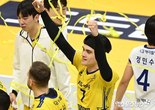 (엑스포츠뉴스 의정부, 김한준 기자) 6일 오후 경기도 의정부실내체육관에서 열린 ‘도드람 2023-2024 V-리그’ KB손해보험과 OK금융그룹의 경기, KB손해보험이 OK금융그룹에 세트스코어 3:0(25-20 25-23 25-17)으로 승리하며 12연패에서 탈출했다. 이날 경기에서 승리한 KB손해보험 리우홍민이 기뻐하고 있다.김한준 기자 kowel@xportsnews.com