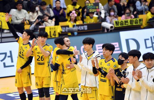 KB 비예나와 선수들이 6일 의정부체육관에서 열린 2023 도드람 V리그 남자부 KB손해보험과 OK금융그룹과의 경기 3세트를 따내며 OK를 셧아웃시킨후 연패탈출의 기쁨을 만끽하고 있다. 2023.12.06.의정부 | 강영조기자 kanjo@sportsseoul.com
