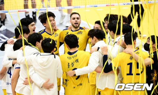 [OSEN=의정부, 조은정 기자]6일 오후 경기도 의정부시 의정부실내체육관에서 ‘도드람 2023-2024 V-리그’ 남자부 3라운드 KB손해보험과 OK금융그룹의 경기가 열렸다. 이날 KB손해보험은 OK금융그룹을 상대로 3-0(25-20, 25-23, 25-17) 셧아웃 승리를 가져가며 12연패를 끊어냈다. KB손해보험이 승리를 기뻐하고 있다. 2023.12.06 /cej@osen.co.kr