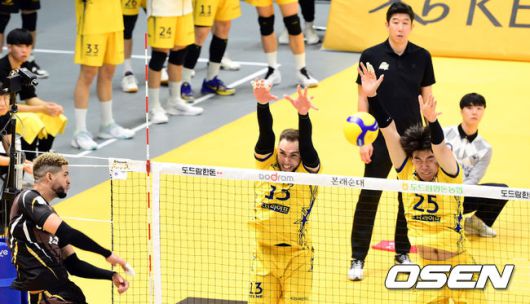 [OSEN=의정부, 조은정 기자]6일 오후 경기도 의정부시 의정부실내체육관에서 ‘도드람 2023-2024 V-리그’ 남자부 3라운드 KB손해보험과 OK금융그룹의 경기가 열렸다. 1세트 KB손해보험 비예나, 한국민이 블로킹에 성공하고 있다. 2023.12.06 /cej@osen.co.kr