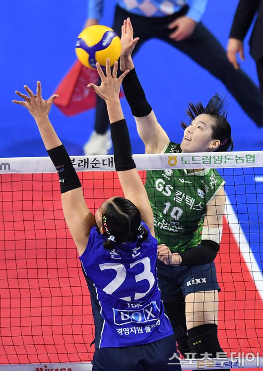[화성(경기)=스포츠투데이 권광일 기자] 2023-2024 도드람 V-리그 여자부 IBK기업은행-GS칼텍스 경기가 6일 오후 경기도 화성시 화정종합체육관에서 열렸다. GS칼텍스 유서연이 공격을 시도하고 있다. 2023.12.06. [스포츠투데이 권광일 기자 sports@stoo.com]