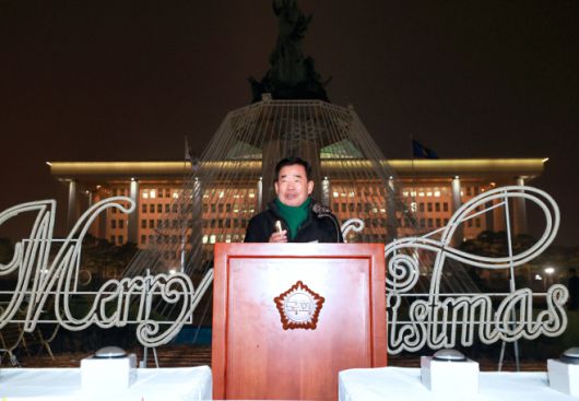 아시아투데이 박지은 기자 = 김진표 국회의장은 6일 오후 국회의원회관 대회의실에서 열린 송년감사예배 참석 후 국회 광장 분수대에 설치된 성탄 트리에 불을 밝혔다.