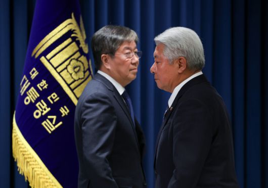 김홍일 방송통신위원장 내정자(오른쪽)가 6일 서울 용산 대통령실 청사에서 소감 발표를 위해 단상으로 향하고 있다. 연합뉴스 |