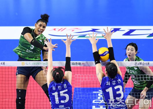 [화성(경기)=스포츠투데이 권광일 기자] 2023-2024 도드람 V-리그 여자부 IBK기업은행-GS칼텍스 경기가 6일 오후 경기도 화성시 화정종합체육관에서 열렸다.