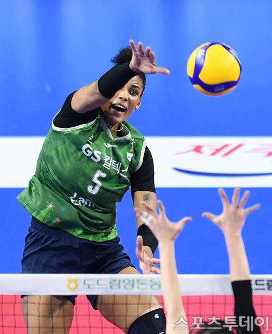 [화성(경기)=스포츠투데이 권광일 기자] 2023-2024 도드람 V-리그 여자부 IBK기업은행-GS칼텍스 경기가 6일 오후 경기도 화성시 화정종합체육관에서 열렸다. GS칼텍스 실바가 강력한 스파이크를 날리고 있다. 2023.12.06. [스포츠투데이 권광일 기자 sports@stoo.com]