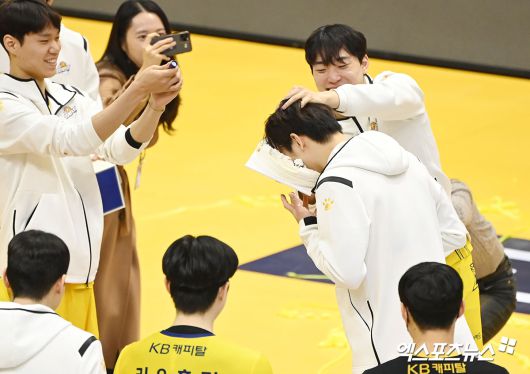 생일을 맞은 KB손해보험 장하랑이 선수단으로부터 축하를 받고 있다.