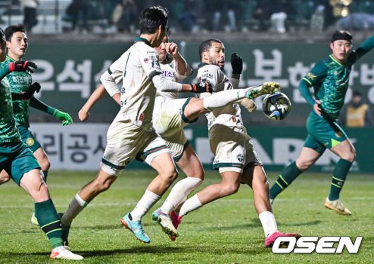[OSEN=김포, 박준형 기자] 6일김포솔터축구장에서 하나원큐 K리그 2023 승강 플레이오프 1차전 김포FC와 강원FC의 경기가 진행됐다 김포는 올 시즌 K리그2 3위로 시즌을 마무리했고 강원은 K리그1 10위를 기록한 팀이다. 후반 강원FC 김영빈이 골찬스를 놓치고 잇다 2023.12.06 / soul1014@osen.co.kr