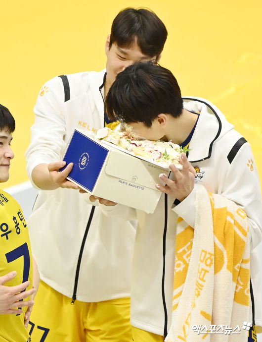 (엑스포츠뉴스 의정부, 김한준 기자) 6일 오후 경기도 의정부실내체육관에서 열린 ‘도드람 2023-2024 V-리그’ KB손해보험과 OK금융그룹의 경기, KB손해보험이 OK금융그룹에 세트스코어 3:0(25-20 25-23 25-17)으로 승리하며 12연패에서 탈출했다. 생일을 맞은 KB손해보험 장하랑이 선수단으로부터 축하를 받고 있다.김한준 기자 kowel@xportsnews.com