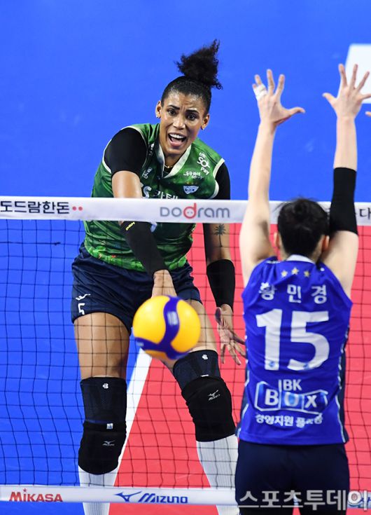 [화성(경기)=스포츠투데이 권광일 기자] 2023-2024 도드람 V-리그 여자부 IBK기업은행-GS칼텍스 경기가 6일 오후 경기도 화성시 화정종합체육관에서 열렸다. GS칼텍스 실바가 스파이크를 날리고 있다. 2023.12.06. [스포츠투데이 권광일 기자 sports@stoo.com]