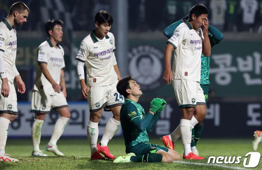 (김포=뉴스1) 김진환 기자 = 6일 오후 경기 김포 솔터축구장에서 열린 하나원큐 K리그 승강 플레이오프 1차전 김포FC와 강원FC의 경기, 김포FC 김태한이 경기 종료 직전 코너킥 상황에서 결정적인 골 찬스를 놓친 뒤 아쉬워하고 있다. 2023.12.6/뉴스1