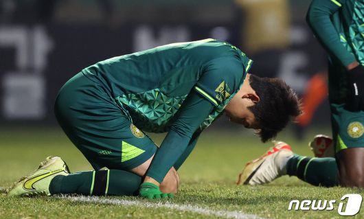 (김포=뉴스1) 김진환 기자 = 6일 오후 경기 김포 솔터축구장에서 열린 하나원큐 K리그 승강 플레이오프 1차전 김포FC와 강원FC의 경기, 김포FC 김태한이 경기 종료 직전 코너킥 상황에서 결정적인 골 찬스를 놓친 뒤 아쉬워하고 있다. 2023.12.6/뉴스1