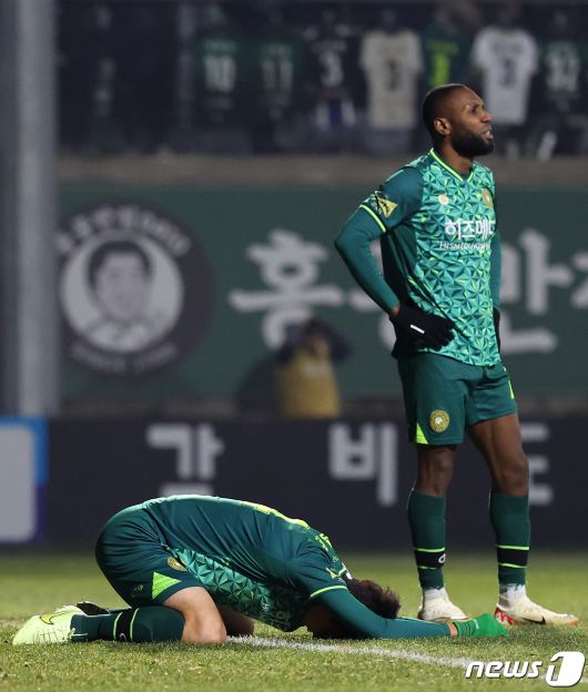 (김포=뉴스1) 김진환 기자 = 6일 오후 경기 김포 솔터축구장에서 열린 하나원큐 K리그 승강 플레이오프 1차전 김포FC와 강원FC의 경기, 김포FC 김태한이 경기 종료 직전 코너킥 상황에서 결정적인 골 찬스를 놓친 뒤 아쉬워하고 있다. 2023.12.6/뉴스1