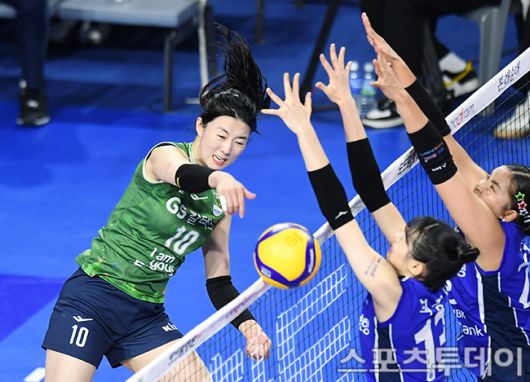 [화성(경기)=스포츠투데이 권광일 기자] 2023-2024 도드람 V-리그 여자부 IBK기업은행-GS칼텍스 경기가 6일 오후 경기도 화성시 화정종합체육관에서 열렸다. GS칼텍스 강소휘가 스파이크를 때리고 있다. 2023.12.06. [스포츠투데이 권광일 기자 sports@stoo.com]