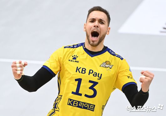 KB손해보험은 23-19서 비예나의 퀵오픈으로 세트포인트를 선점했다. 상대 레오의 서브 범실로 25점째를 완성했다.