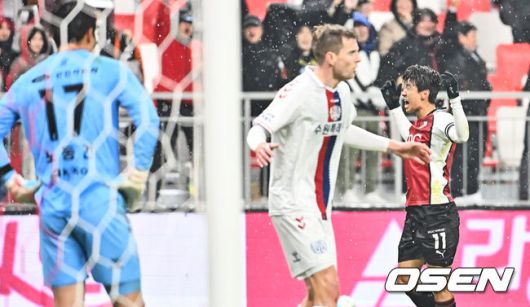 [OSEN=부산, 이석우 기자] 6일 부산아시아드주경기장에서 K리그 승강 플레이오프(PO) 1차전 부산 아이파크와 수원FC의 경기가 열렸다. 부산 아이파크 김정환이 후반 끝무렵 페널티킥을 얻어내고 환호하고 있다. 2023.12.06 / foto0307@osen.co.kr