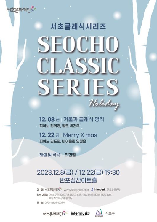 추운 겨울, <서초 클래식 시리즈: Holiday> 공연을 통해 겨울의 정취를 담은 따스한 클래식 음악들로 관객들의 마음을 녹이고자 한다. 본 공연은 전석 2만원으로 티켓 예매 및 자세한 정보는 서초문화재단(www.seochocf.or.kr) 홈페이지를 통해 확인이 가능하다.