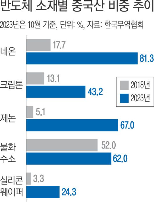 반도체 회로의 패턴 중 불필요한 부분을 깎아내는 ‘식각공정’에 쓰이는 크립톤·제논도 마찬가지다. 크립톤의 중국산 비중은 2018년 13.1%에서 올해 43.2%로 대폭 늘었다. 제논도 같은 기간 5.1%에서 67.0%로 급증했다. 제논의 경우 중국산 수입액은 2018년 180만달러였으나 지난해 2억3909만달러로 100배 넘게 급증했다.