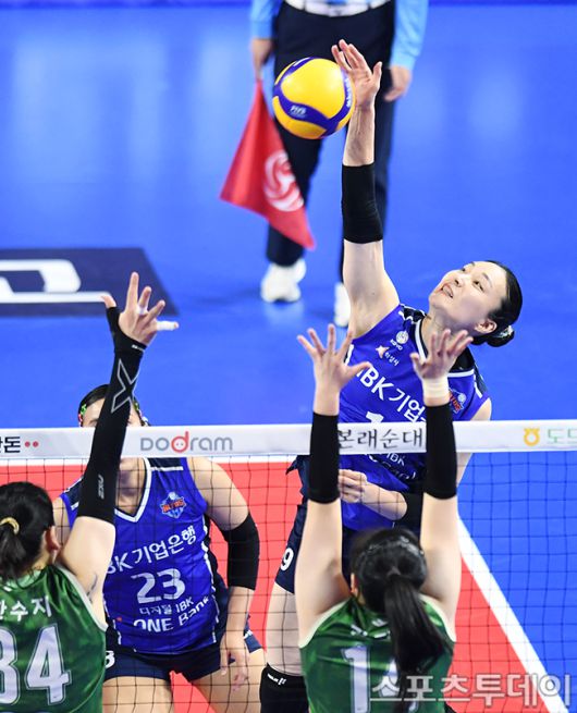 [화성(경기)=스포츠투데이 권광일 기자] 2023-2024 도드람 V-리그 여자부 IBK기업은행-GS칼텍스 경기가 6일 오후 경기도 화성시 화정종합체육관에서 열렸다.