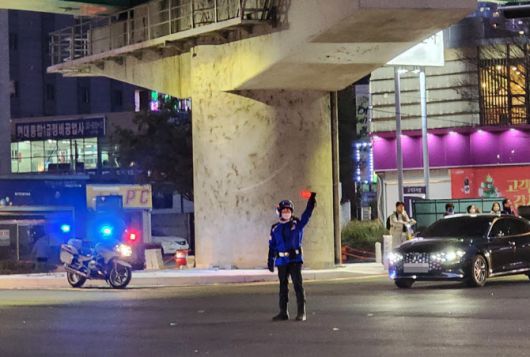 6일 오후 울산 남구 지역 일대에 정전이 발생하면서 신호등도 멈췄다. 경찰관이 수신호로 차량 통행을 제어하고 있다. (사진=울산경찰청) |
