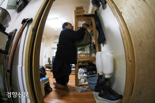 장애인인 윤용주 동자동사랑방 대표가 6일 서울 용산구 동자동 쪽방촌 자택에서 세탁물을 정리하고 있다. 한수빈 기자 subinhann@kyunghyang.com |