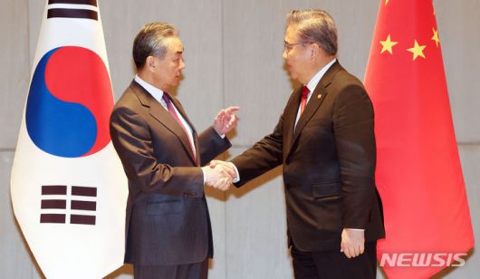 [부산=뉴시스] 하경민 기자 = 박진 외교부 장관이 26일 부산 해운대구 시그니엘부산 호텔에서 왕이 중국공산당 중앙외사공작위원회 판공실 주임 겸 외교부장과 회담을 갖기에 앞서 악수하고 있다. (공동취재) 2023.11.26. photo@newsis.com |