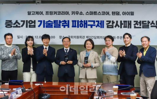 [이데일리 김태형 기자] 장태관(왼쪽 세번째) 경청 이사장이 6일 국회 의원회관에서 대기업과의 기술탈취 분쟁에서 피해 중소기업을 위해 노력해 온 국민의힘 한무경(다섯번째) 의원과 더불어민주당 김경만(네번째) 의원에게 감사패를 전달하고 관계자들과 기념촬영을 하고 있다.