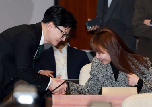 한동훈 법무부 장관이 6일 국회 예결위회의장에서 열린 국민의힘 정책의원총회에 참석하며 김예지 의원과 악수하고 있다. /연합뉴스 |