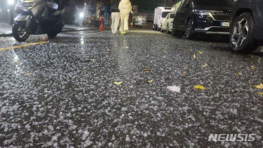 [부산=뉴시스]이동민 기자 = 6일 밤 부산 곳곳에서 우박이 쏟아졌다.