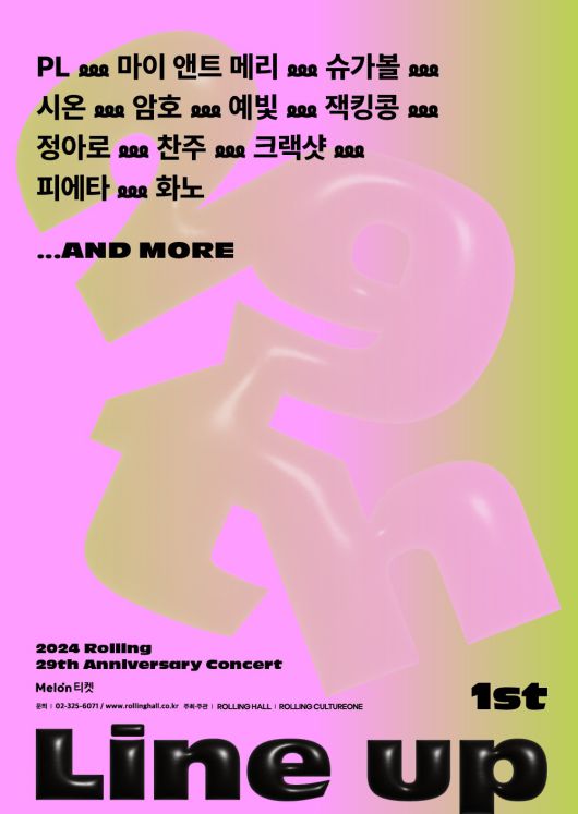 롤링홀 29주년 기념 공연은 올해 1월부터 6월까지 진행될 예정이며 앞으로 순차적으로 공개되는 라인업에 팬들의 기대감이 한층 높아지고 있다. 자세한 내용은 롤링홀 홈페이지 또는 롤링홀 공식 SNS 계정에서 확인 가능하며 공연 예매는 멜론티켓에서 가능하다.