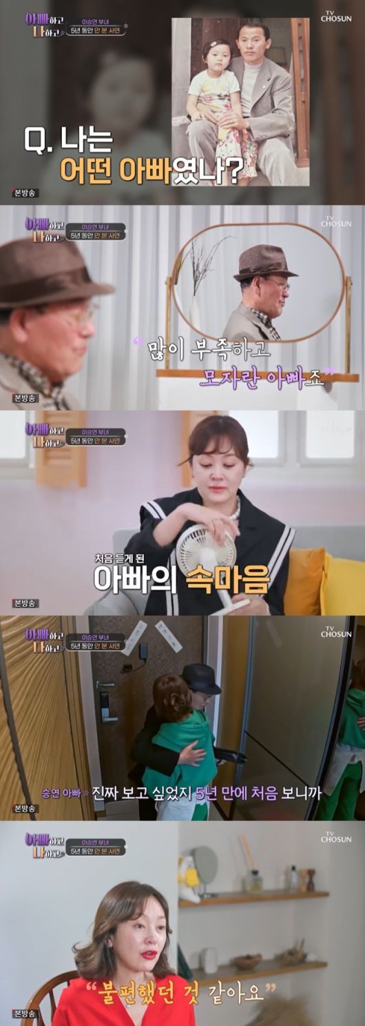 이승연 아버지는 5년만에 딸을 보자마자 와락 끌어안았다. 그는 "아주 반갑고 말로 표현할 수 없을 정도로 기쁘다"라고 속내를 밝히기도 했다. 반면 이승연은 "불편했던 것 같다. 어색했다"라고 솔직한 생각을 전했다.