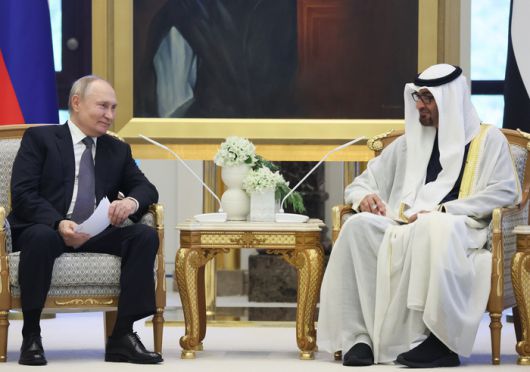 블라디미르 푸틴(왼쪽) 러시아 대통령이 6일(현지시간) 아랍에미리트연합(UAE)을 방문해 무함마드 빈 자이드 알나하얀 대통령과 대화하고 있다. TASS연합뉴스 |