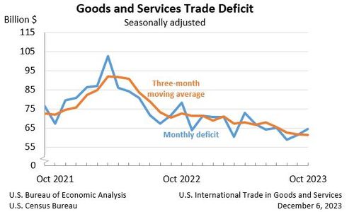 6일(현지시간) 미 상무부 발표에 따르면 10월 미국 무역수지 적자는 643억달러로 전월 대비 31억달러(5.1%) 증가했다.