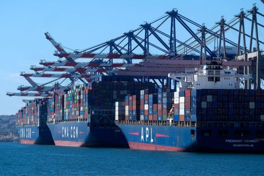 미국 캘리포니아주 산페드로의 로스앤젤레스(LA)항에서 컨테이너들을 가득 실은 화물선들이 하역을 대기하고 있다. /연합뉴스 |