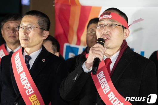 (서울=뉴스1) 유승관 기자 = 최대집 대한민국 의료붕괴 저리를 위한 범의료계 대책 특별위원장이 6일 서울 용산구 대한의사협회 회관 앞에서 정부의 의대 증원 추진 등이 불합리한 정책추진이라고 주장하며 철야 시위 및 릴레이 1인 시위 기자회견을 하고 있다. 왼쪽은 이필수 대한의사협회장. 대한민국 의료붕괴 저지를 위한 범의료계 대책 특별위원회는 이날 정부의 일방적인 의대 정원 증원 정책에 반대하며 대한의사협회 회관 천막농성장과 용산 대통령실 앞에서 동시에 철야 릴레이 1인 시위를 진행한다. 2023.12.6/뉴스1