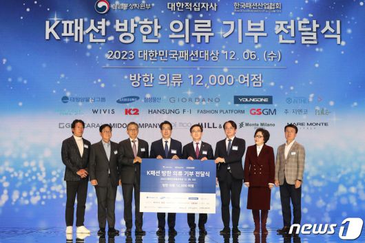(서울=뉴스1) 유승관 기자 = 6일 서울 강남구 섬유센터에서 열린 '2023 대한민국 패션대상'에서 취약계층 K패션 방한의류 기부 전달식이 열리고 있다. 왼쪽부터 박원희 패션플랫폼 회장, 도상현 위비스 회장, 한준석 한국패션산업협회 회장, 이용필 산업통상자원부 첨단산업정책관, 이상천 대한적십자사 사무총장, 박재용 영원무역 사장, 서순희 던필드그룹 회장, 이준서 삼성물산 패션부문 부사장. (한국패션산업협회 제공) 2023.12.6/뉴스1