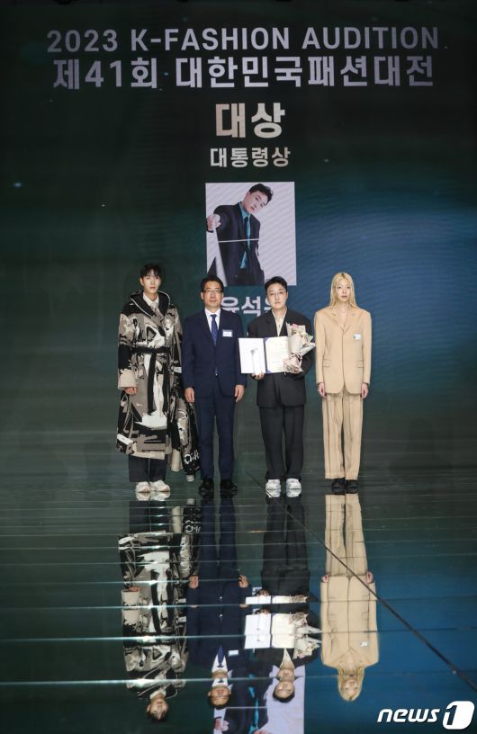 (서울=뉴스1) 유승관 기자 = 6일 서울 강남구 섬유센터에서 열린 '2023 대한민국 패션대상'에서 K패션 오디션 오디션 대통령상 시상자와 수상자들이 기념촬영을 하고 있다. 이용필 산업통상자원부 첨단산업정책관(왼쪽 두 번째), 윤석운 석운윤 대표(왼쪽 세 번째). (한국패션산업협회 제공) 2023.12.6/뉴스1
